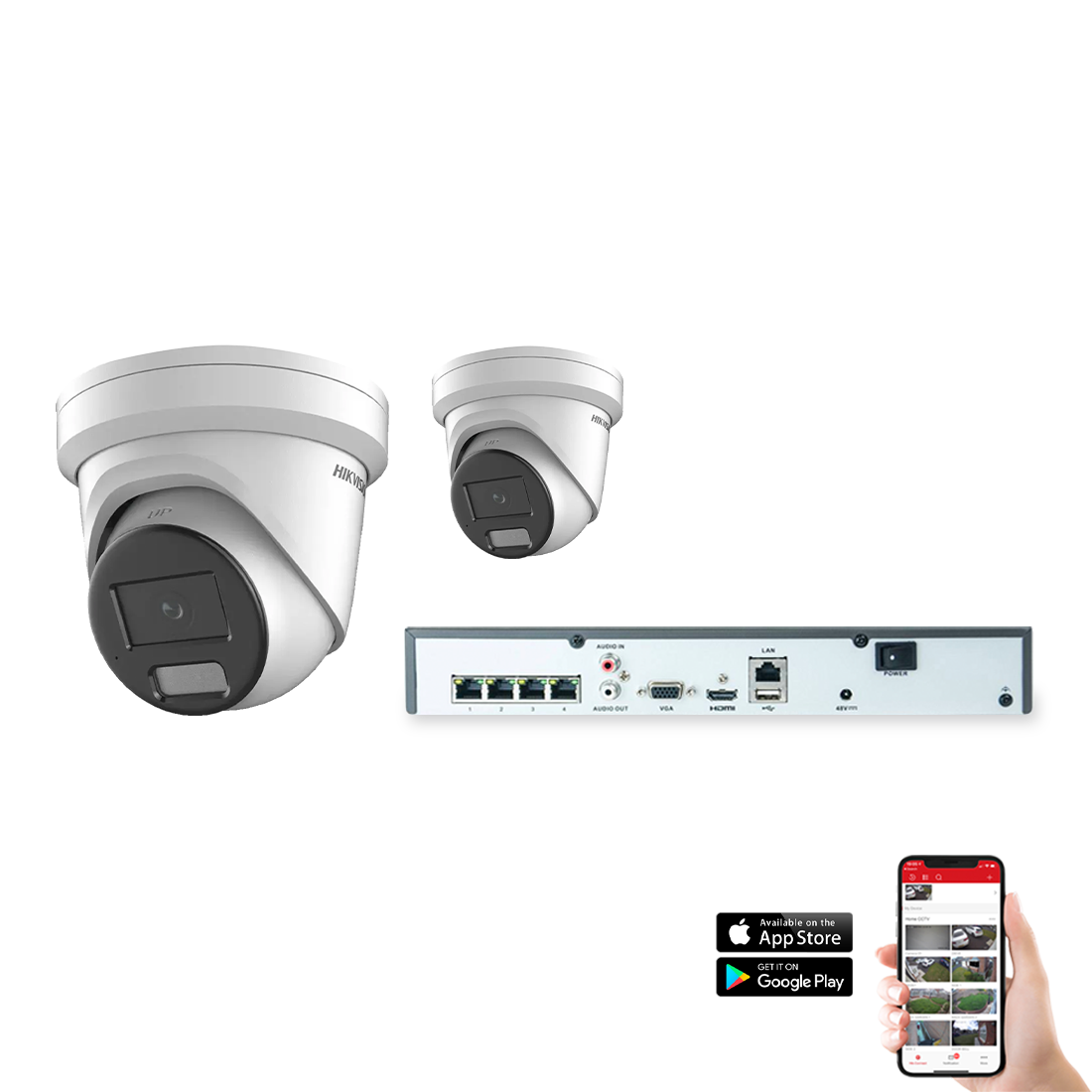 Monitor your property like never before with this outstanding 4MP HD security system from HiLook. The HIK-KIT-IPC-HYB-4MP-2 includes our cutting edge Hikvision 4 channel 4K NVR with 2 Hikvision turret dome security cameras featuring 4MP HD resolution. The included weatherproof cameras deliver exceptional image quality day or night, powered by Hybrid ColorVu technology which allows it to produce detailed colour images in total darkness, a fantastic feature for night time surveillance. See up to 40m with the camera’s powerful integrated infrared illumination and will activate white light when motion is detected. Recording and monitoring audio offers an extra level of protection, with the built in microphone your camera now hears and sees events in and around your property.